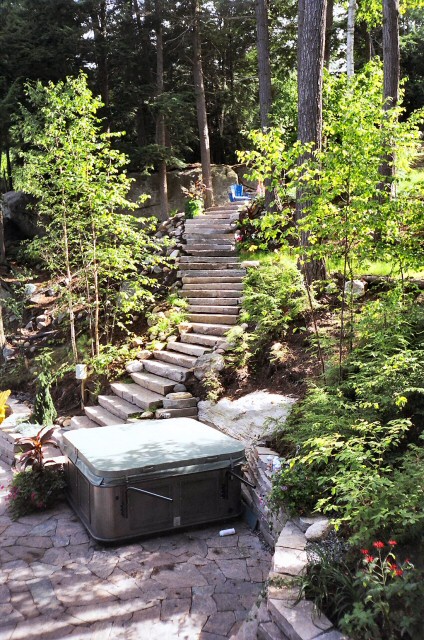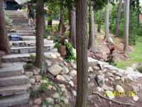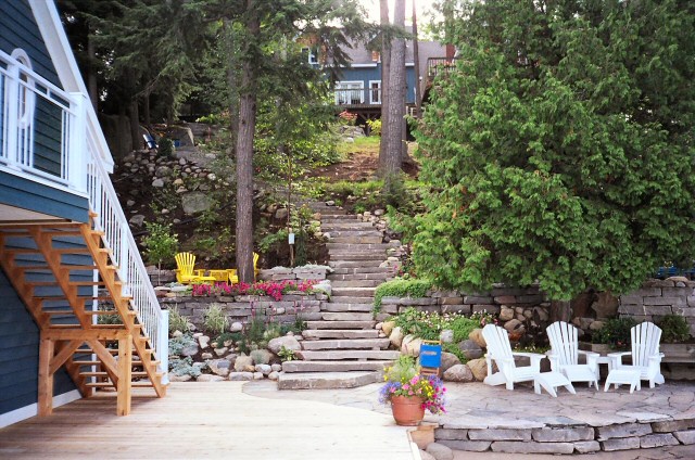Natural stone landscaping in Parry Sound / Muskoka and the Georgian Bay Area. Quality flagstone hand carved and dry laid. Transform bush into trails down to waters edge with terraced patio's walkways and steps used to turn steep grade cottage lots into fine estates on Lake Muskoka, Joseph, Rosseau, and the Georgian Bay. All work guaranteed.