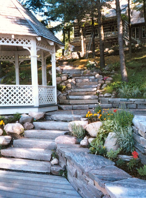 Natural stone landscaping in Parry Sound / Muskoka and the Georgian Bay Area. Quality flagstone hand carved and dry laid. Transform bush into trails down to waters edge with terraced patio's walkways and steps used to turn steep grade cottage lots into fine estates on Lake Muskoka, Joseph, Rosseau, and the Georgian Bay. All work guaranteed.